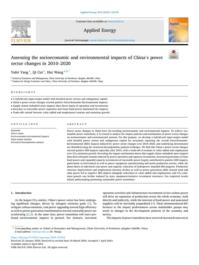 构建了拓展中国电力生产部门和内生化资本的混合单位投入产出模型;量化了2010-2020年中国电力生产转型的社会经济环境影响并揭示了影响路径、关键因素及三种影响之间的协同与抵消作用。