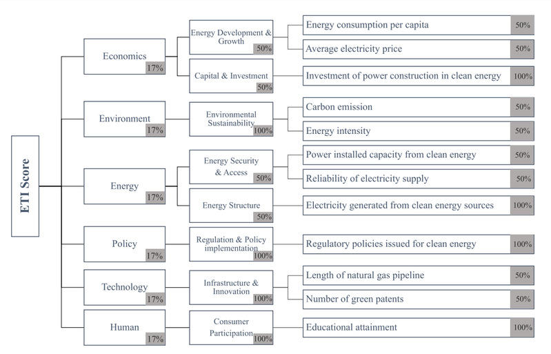 本文在世界经济论坛(WEF,2021)的基础上发展了ETI省级概念框架,对其进行了修改以适应中国的背景。本研究选择了政策维度,将能源系统的结构、安全和获取纳入能源维度;资本和投资以及经济发展增长也被纳入经济层面。确定了ETI建设的六个维度和八个子维度,包括经济(能源发展和增长、资本和投资)、环境(环境可持续性)、能源(能源安全和获取、能源结构)、政策(监管和政策实施)、技术(基础设施和创新)和人(消费者参与)维度(Neofytou等人,2020)。本文对ETI的六个维度赋予了相等的权重(1/6),如图1所示。