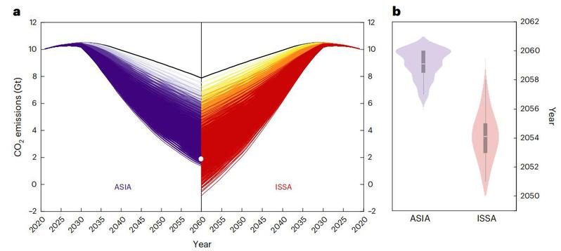 与ISSA相比,在ASIA下实现碳中和的时间预计将推迟约5-6年。对于成功实现碳中和目标的情景,ISSA下实现碳中和的平均年份为2054年,而ASIA下为2059年。