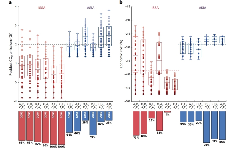 图3. 与ISSA相比,ASIA下的碳减排和政策组合的经济成本(%)