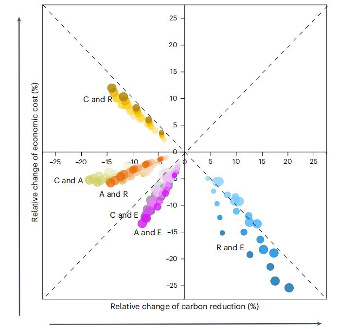 可再生能源和终端电气化(R和E)政策组合的显著协同效应,与ISSA相比,到2060年,ASIA的碳减排量增加了5%~20%,累计GDP成本降低了-5%~25%。当具有互补机制的减排政策共同实施时,就会产生协同效应,扩大其潜在的政策空间。相反,当联合实施具有竞争机制的减排政策时,会出现权衡效应,压缩其政策空间。
