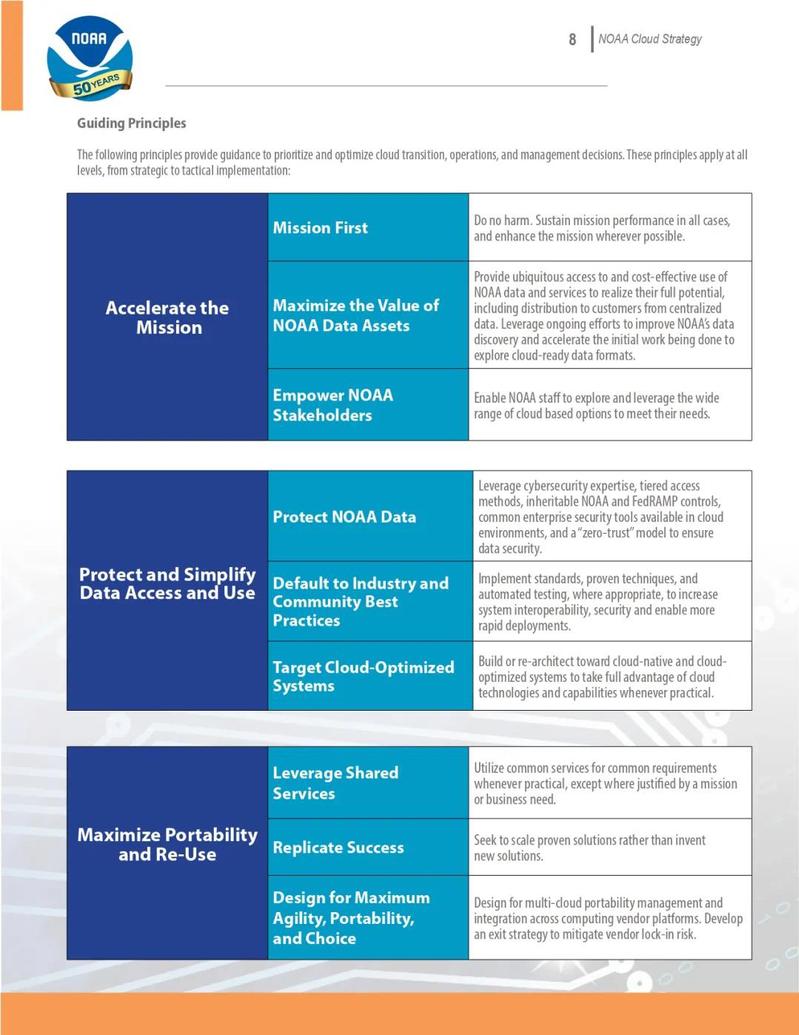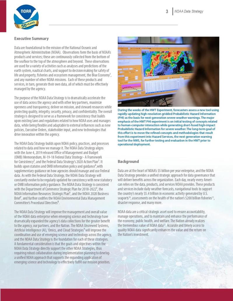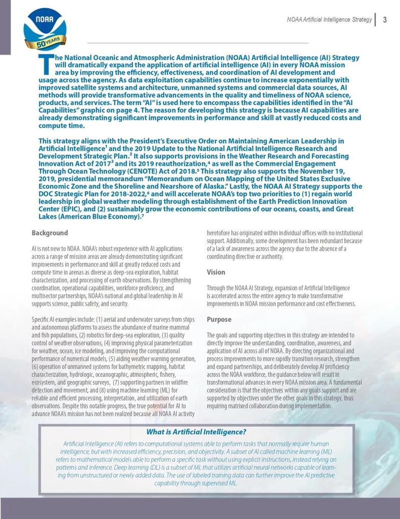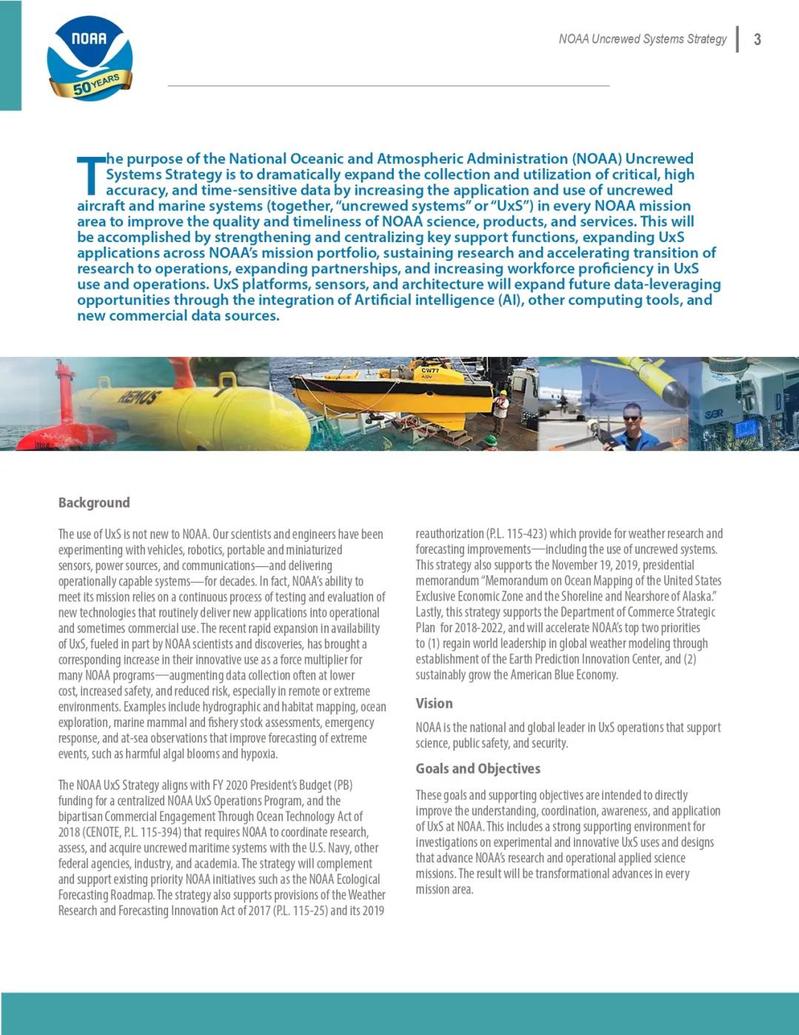 The use of these tools is not new to NOAA. In fact we have robust experience and demonstrated leadership with applications across a variety of mission areas and are already delivering successful operational systems that are beginning to pay dividends. To illustrate, UxS is already helping us map and explore more of America’s oceans, coasts, and Great Lakes; AI is analyzing satellite data for severe weather and wildfire detection; Cloud computing partnerships with commercial cloud service providers allow NOAA to make more of its valuable data publicly accessible; NOAA already manages (or has extensive experience managing) environmental data that form the basis of NOAA's scientific products and services; and, ‘omics is already informing fisheries management decisions. Implementing our strategies more fully will accelerate these advances and serve as force multipliers to solve tough problems and set the course to strengthen our environmental S&T leadership for the coming decades.