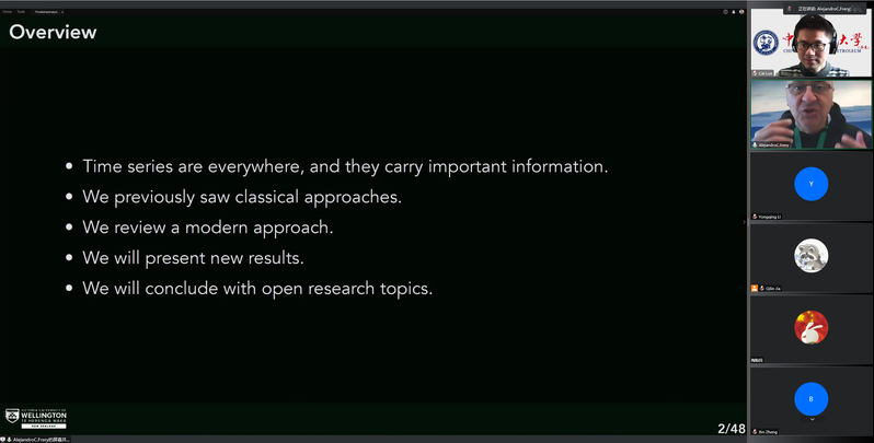 12月7日上午,依托科技部高端外国专家引进计划“海洋空间信息智能处理理论与方法国际合作研究”项目的支持,应海空学院任鹏教授邀请新西兰威灵顿维多利亚大学Alejandro Frery教授做客“海空论坛”,做题为“Time Series Analysis with Ordinal Patterns ”的学术报告,并与参会专家和学生进行线上学术交流。本次学术报告吸引了全国大地智能信号处理领域专家学者、研究生100余人线上参会交流,报告会由罗偲副教授主持。