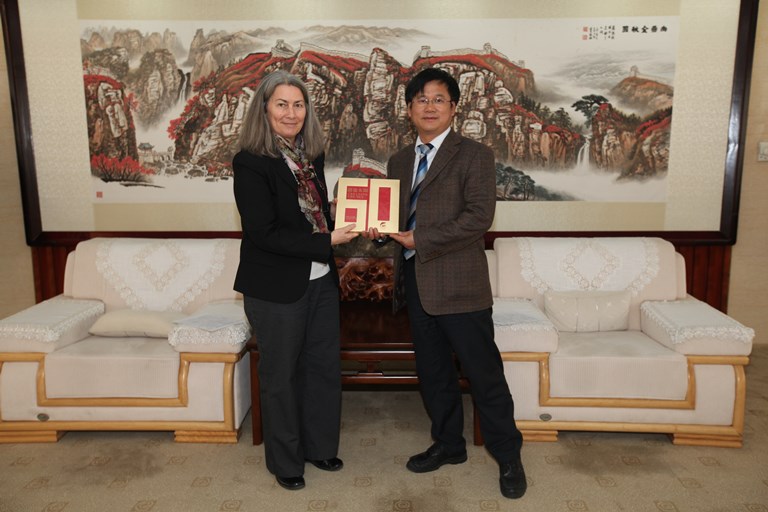 查明向劳拉·斯托赠送校庆纪念品(摄影:王大勇)