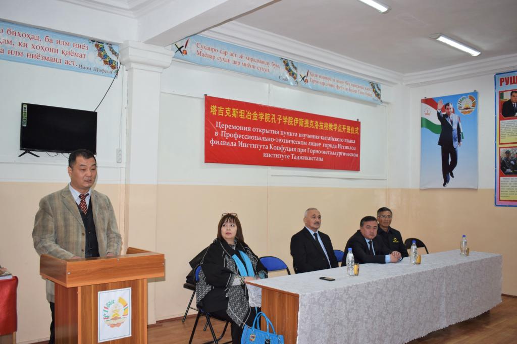 2017年12月1日,孔子学院在伊斯提克罗尔市职业技校汉语教学点举办开班典礼。典礼由孔子学院外方院长扎法尔主持,伊斯提克罗尔市市长阿蒙佐达、中塔工业园区管理有限公司执行总经理吴春辉、孔子学院中外方院长、索格特州和共和国报社记者以及该技校领导、师生等参加开班典礼。