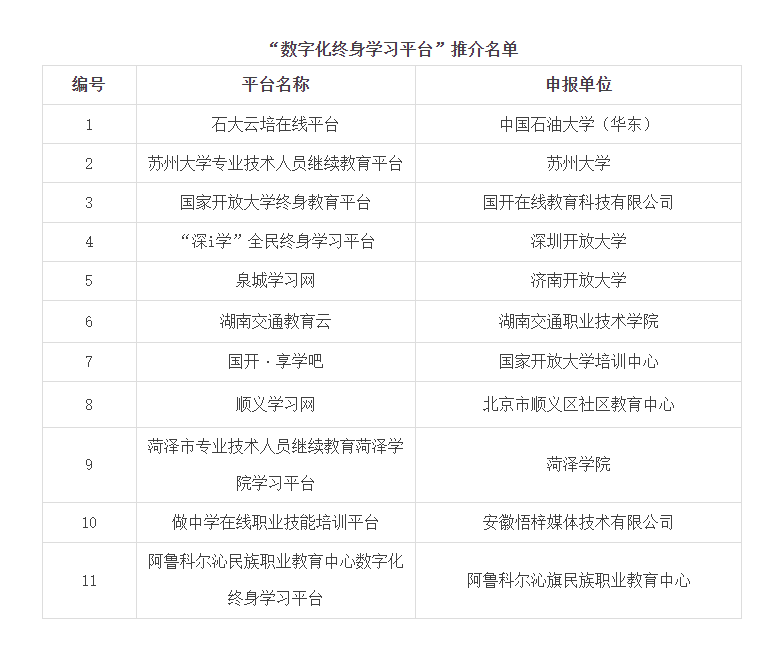 “数字化终身学习平台”推介名单