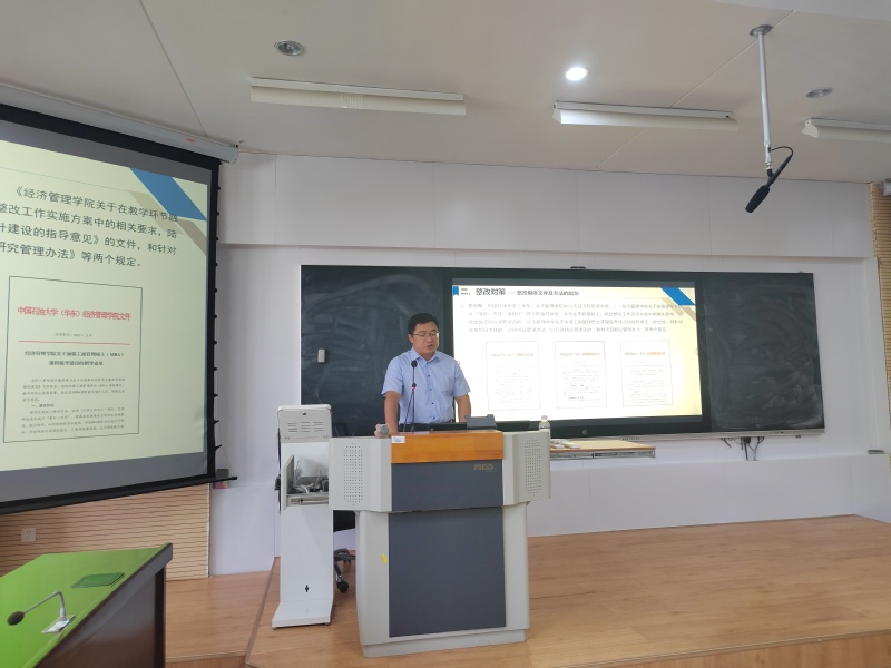 徐小峰副院长代表学院汇报通过认证以来学院整改工作的进展,他从战略规划、课程建设、师资培养、科研提升、校友工作等各个层面逐项进行汇报。