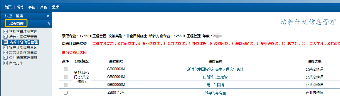 功能菜单:培养 → 培养管理 → 培养计划信息管理