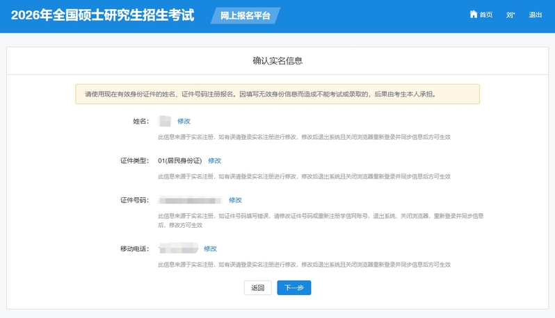 2. 确认实名信息,点击“下一步”,务必确认移动电话是否正确,如需修改请点击修改