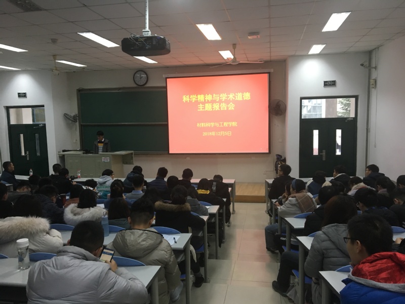 为提高材料科学与工程学院研究生的学术道德修养,加强对学术诚信重要性的认识,培养良好的工作、学习习惯,12月5日下午,学院在西环103教室召开“科学精神与学术道德”主题报告会。学院副院长张军教授、院长助理曹宁副教授应邀出席,2018级全体研究生参加此次报告会。