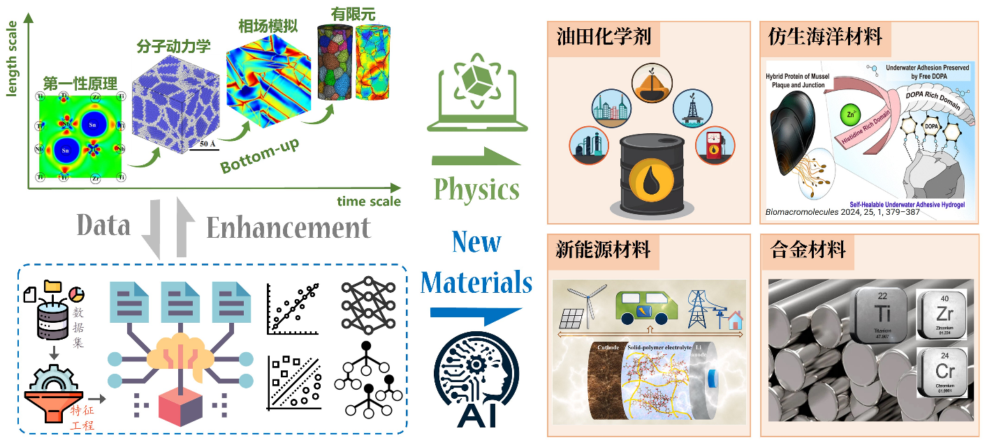 ◎研究方向 基于人工智能(AI)与计算模拟方法,发展AI4S创新研究范式,开发高精度分子力场及多尺度耦合模型,构建材料大数据集;在此基础上,研究稠油、聚合物、生物膜、蛋白质等复杂软凝聚态体系中的物理现象及分子机制,基于“物理-数据”联合驱动开展材料性能预测与新材料逆向设计。目前,主要在研课题包括: