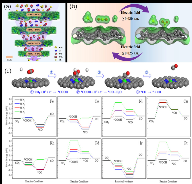 此外,分别研究了连续应变、电场作用下碳基分离膜对CO2等气体的分离行为以及过渡金属中心M-Nx-C上的CO2电催化还原机制。发现通过碳氮膜的“开放”和“封闭”状态可以实现应变控制混合CH4、N2、CO、CO2和H2的连续分离;施加电场可以显著提高CO2在PG纳米片上的结合强度;研究了12种过渡金属中心(Fe-、Co-、Ni-、Cu-、Rh-、Pd-、Ir-和Pt-)等嵌入双空穴石墨烯结构,并从CO2RR的活性和选择性进行了筛选。相关研究成果《应变控制的连续可调碳氮膜气体分离性能的理论研究》(Strain-controlled carbon nitride: A continuously tunable membrane for gas separation)、《电场调控五边形石墨烯中CO2捕获与分离的理论研究》(Penta-graphene as a promising controllable CO2 capture and separation material in an electric field)、《过渡金属单原子负载氮掺杂碳表面用于CO2电催化研究:生成CO还是转化CO?》(Single transition metal atoms on nitrogen-doped carbon for CO2 electrocatalytic reduction: CO production or further CO reduction?)发表在Applied Surface Science杂志(Appl. Surface Sci., 2020, 506, 144675;Appl. Surface Sci., 2020, 502, 144067;Appl. Surface Sci., 2020, 533, 147466)。第一作者分别为王茂槐、王茂槐、郭琛,鲁效庆教授为通讯作者。Applied Surface Science最新影响因子为6.182。