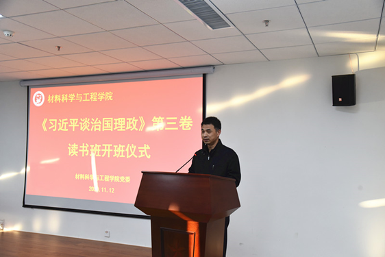 11月12日,材料科学与工程学院《习近平谈治国理政》第三卷读书班开班仪式在古镇口校区新能源大厦239报告厅举行。学校党委组织部、党委学生工作部、党委研工部、学院党委有关负责同志、辅导员、教工党支部支委、学生党支部支委共计60余人参加。党委副书记孙启龙主持开班仪式。