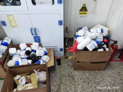 5 | 工科楼E0361-E0363 | 1.大量危废未处置,危废区缺少标识。 |