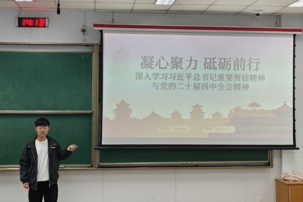 活动伊始,孙浩鑫带领全体支部成员系统学习了习近平总书记重要贺信原文,深入解读贺信中蕴含的坚定信念、家国情怀与使命担当。贺信背景与时代坐标的解读环节,孙浩鑫系统梳理总书记重要贺信的对象,活动意义与时间节点的特殊性,阐明贺信是立足“世界之变、时代之变、历史之变”的战略指引,为新时代青年和各行业工作者锚定奋斗航向。思想方法与工作启示的分享阶段,孙浩鑫结合党的二十届四中全会提出的“四个优势更加彰显”重大判断,解读“两个结合”的科学方法与“实事求是、真抓实干”的实践要求,将贺信精神与全会部署贯通起来,明确“在大局下谋划、在实处见成效”的实践路径。随后,通过讲述分析典型案例形式,支部成员们一起解读了全会审议通过的《中共中央关于制定国民经济和社会发展第十五个五年规划的建议》,聚焦青年在科技创新、乡村振兴、基层治理等领域的责任使命,深化了对两项重要精神实践要求的理解。最后,孙浩鑫对本次专题学习班会进行总结与展望,他紧扣全会精神与贺信精神的核心要义,结合当代青年的使命担当与实际行动路径展开分享,既和支部成员交流了本次学习的收获感悟,也抒发了自己将个人理想融入祖国发展事业的坚定期盼。