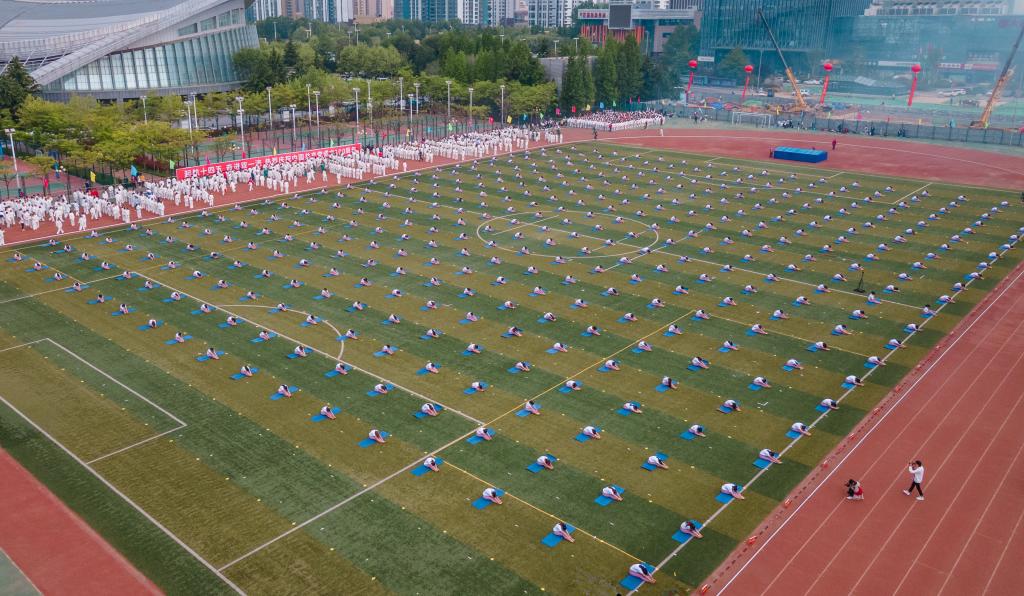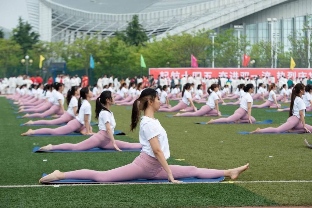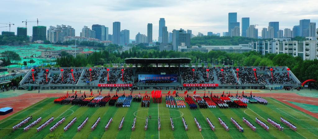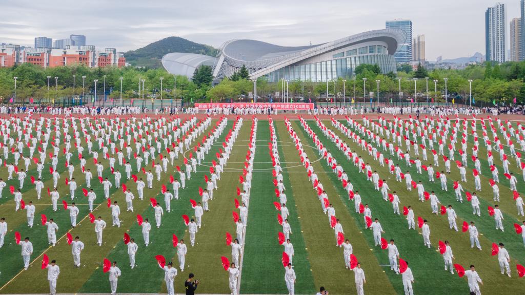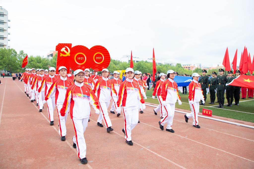 运动场上一片欢腾。学生柔韧的瑜伽表演伴随着《歌唱祖国》的旋律,展现出大学生的青春朝气;利落精到的太极拳表演彰显了教职工的昂扬风采;刚柔并济的太极扇一展文化之韵,气势恢宏,队伍跟随激昂的音乐变换队形,用太极扇摆出“中国共产党”“100”等字样,献礼建党100周年。在观众的阵阵欢呼与掌声中,2021年田径运动会正式拉开了大幕。