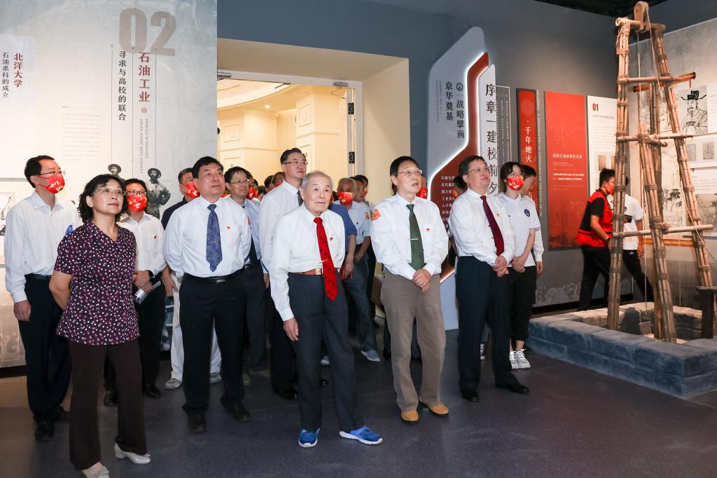“学校参与了西南石油学院、西安石油学院、大庆石油学院的援建工作,实现了成建制援助。”当看到《1958~1961年援建各石油高校专任教师情况》的图表时,方华灿对此印象深刻,向众人特别指出学校为新中国石油高等教育体系的建立和完善,石油高等教育事业的发展做出了重要贡献,体现了石大人“家国同心”的价值追求。参观至干打垒展区时,李阳接过讲解员的话筒表示,他仿佛又回到了1977年刚到学校那段求学历程,“实事求是,艰苦奋斗”的校风,让他懂得在人的一生中要有所建树,就必须要脚踏实地,艰苦奋斗。时隔24年,一张学校首个全国大学生“挑战杯”大赛一等奖的获奖照片触发了朱光有的回忆,谈及获奖经历时,他认为大学生创新要立足实际,尽量与所学专业结合起来,同时需要辛勤付出和耐得住寂寞,做“惟真惟实”的石大人。作为创造太阳能源服务(青岛)有限公司的联合创始人,段晓飞结合自身的创客经历,希望与石大学子一同不忘初心、“追求卓越”,继续做有大国担当的中国青年,讲好石大青年“一带一路”创业故事。