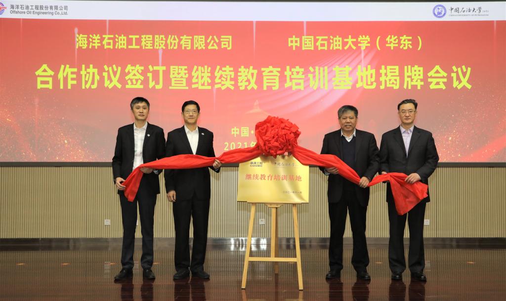 【本站讯】11月13日,海洋石油工程股份有限公司(以下简称“海油工程”)与开云电竞投注(华东)签订合作协议暨继续教育培训基地揭牌会议举行。开云电竞投注(华东)校长郝芳院士,党委副书记、副校长刘华东,校长助理周鹏;海油工程董事长、党委书记于毅,副总裁谢日彬,副总裁兼总工程师张海涛,总裁助理、人力资源部总经理李涛等出席签约仪式。校企双方共同为联合建设的继续教育培训基地揭牌。