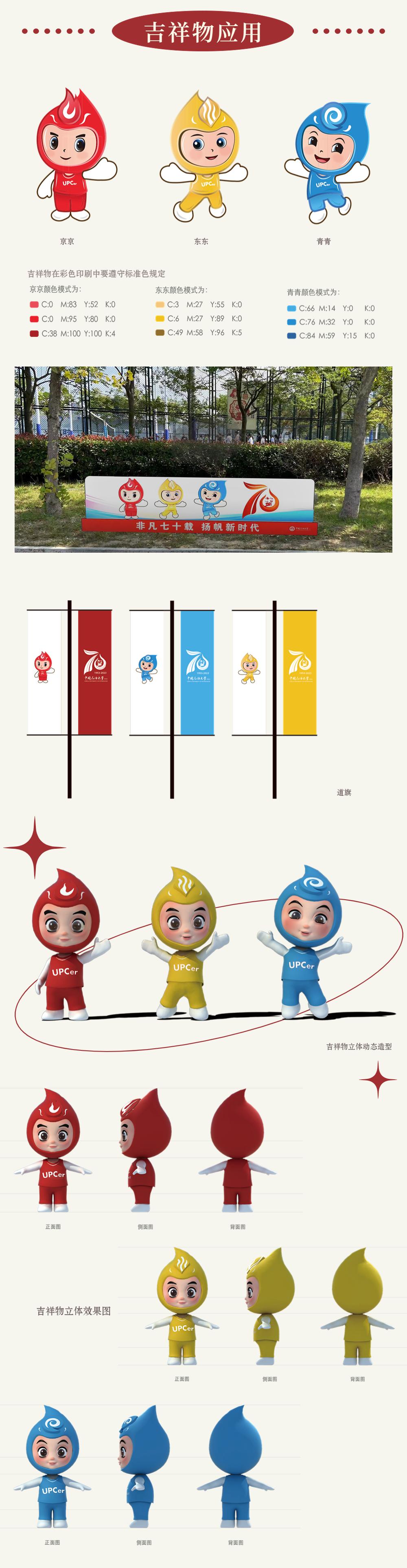 吉祥物以学校70年发展中北京、东营、青岛三地办学历程为设计灵感,由三个活泼可爱的卡通形象组成,依次取名京京、东东、青青,分别以红色、黄色、蓝色为主色调,生动展示了学校从首都北京到黄河入海口,再到魅力海滨之城的变迁。