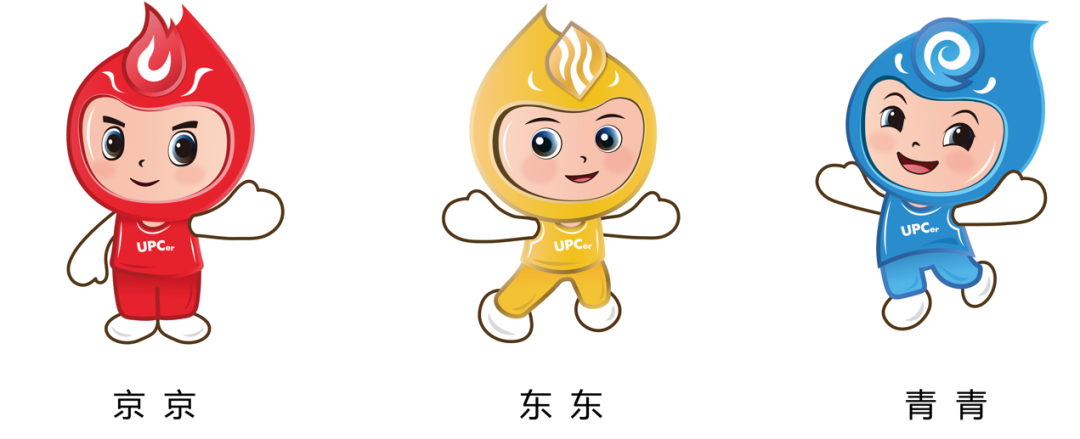 吉祥物头部整体设计为“油滴”“火苗”造型,欢快灵动,直观体现了学校的石油能源特色。“京京”的头饰为火焰,象征能源,也代表学校发展的火苗从北京点燃;“东东”的头饰为河流,象征黄河,代表学校来到黄河三角洲成长发展;“青青”的头饰为浪花,象征海洋,也代表了学校面朝大海,走向更加广阔的未来。