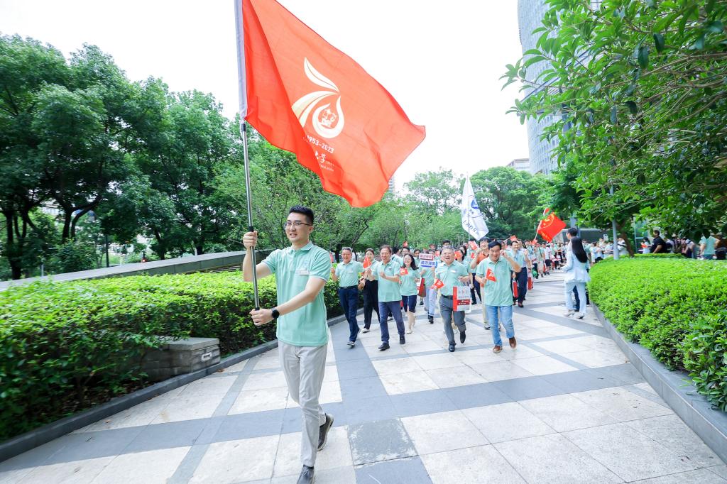 王勇为校友代表金立华授校庆旗,于连栋宣布校庆旗传递上海站活动正式开始。与会校友参加校庆旗团跑传递,向学校建校70周年献礼致敬。