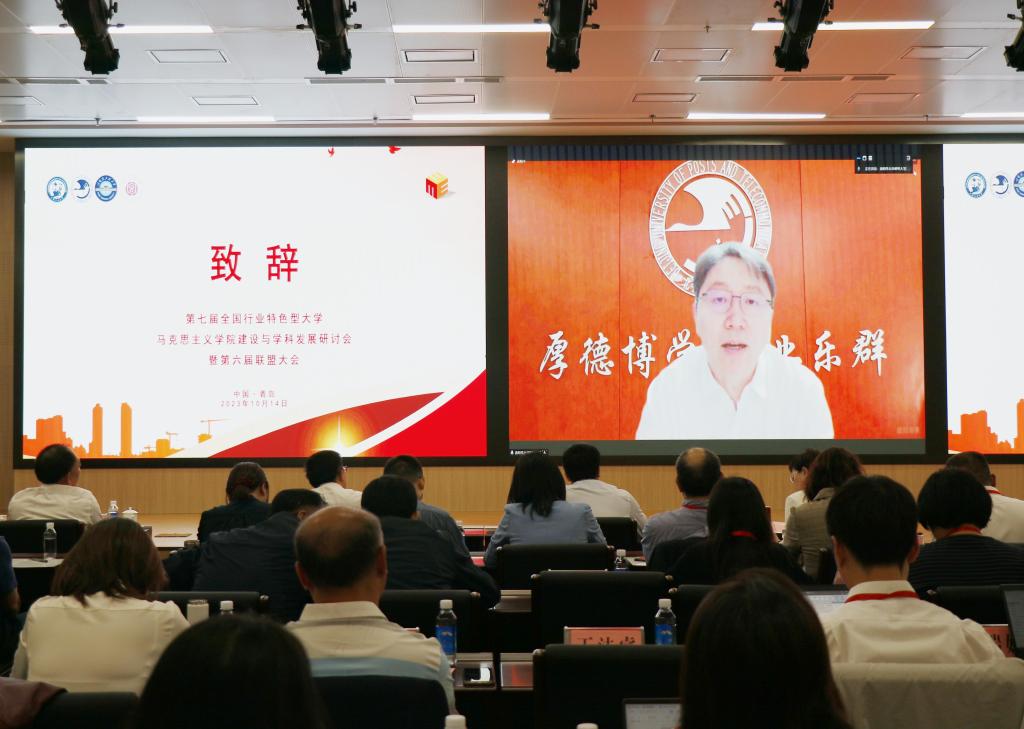 【本站讯】10月14日,第七届全国行业特色型大学马克思主义学院建设与学科发展研讨会暨第六届联盟大会在我校举行。大会以“深入学习党的二十大精神,坚守政治底色,立足行业特色,协同促进行业特色型马克思主义学院建设,积极推进马克思主义理论学科高质量发展”为主题,来自全国20余所高校马克思主义学院的领导、专家学者齐聚一堂,共商学院建设,共谋学科发展。大会以“线上+线下”相结合的方式进行。