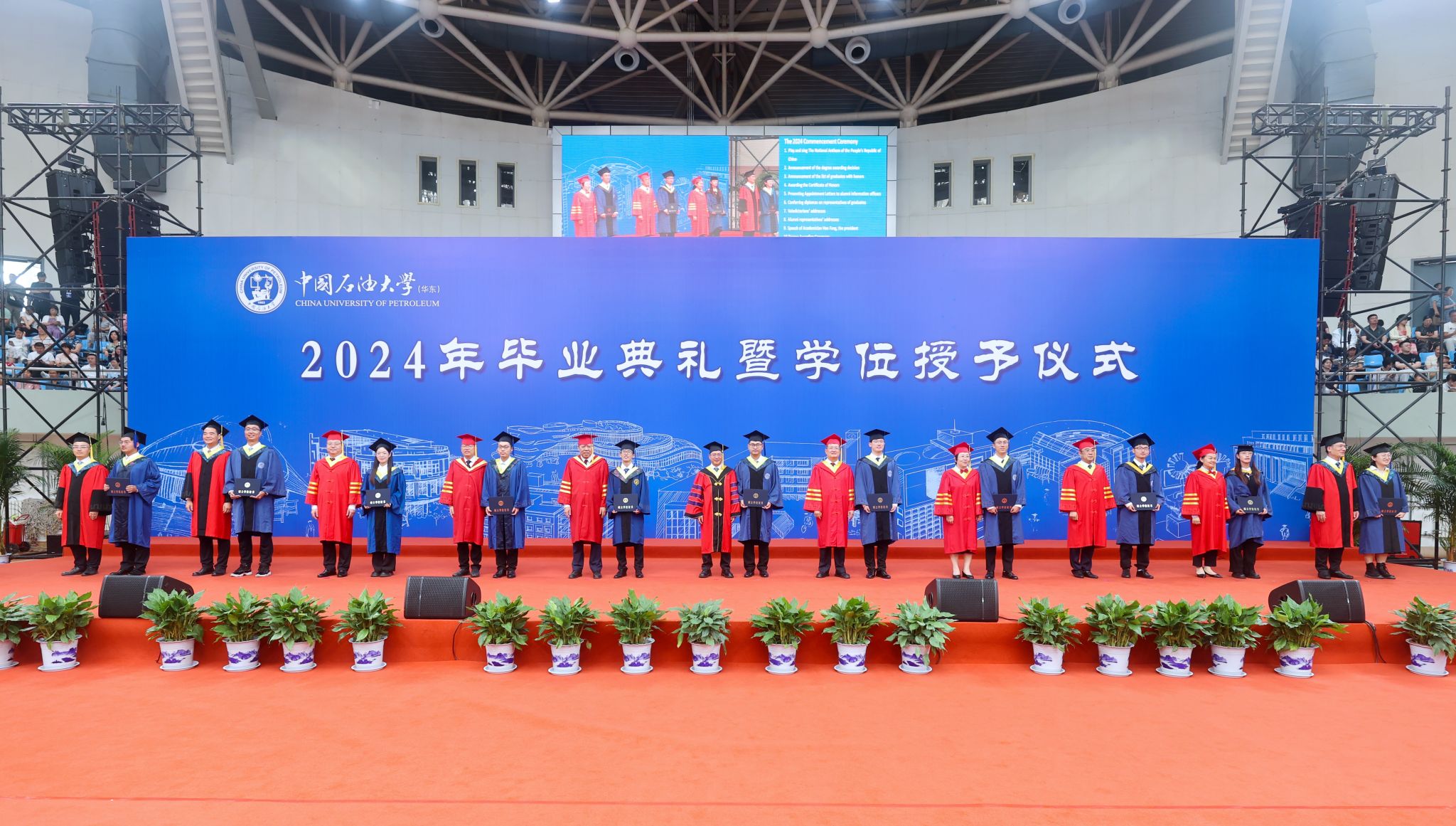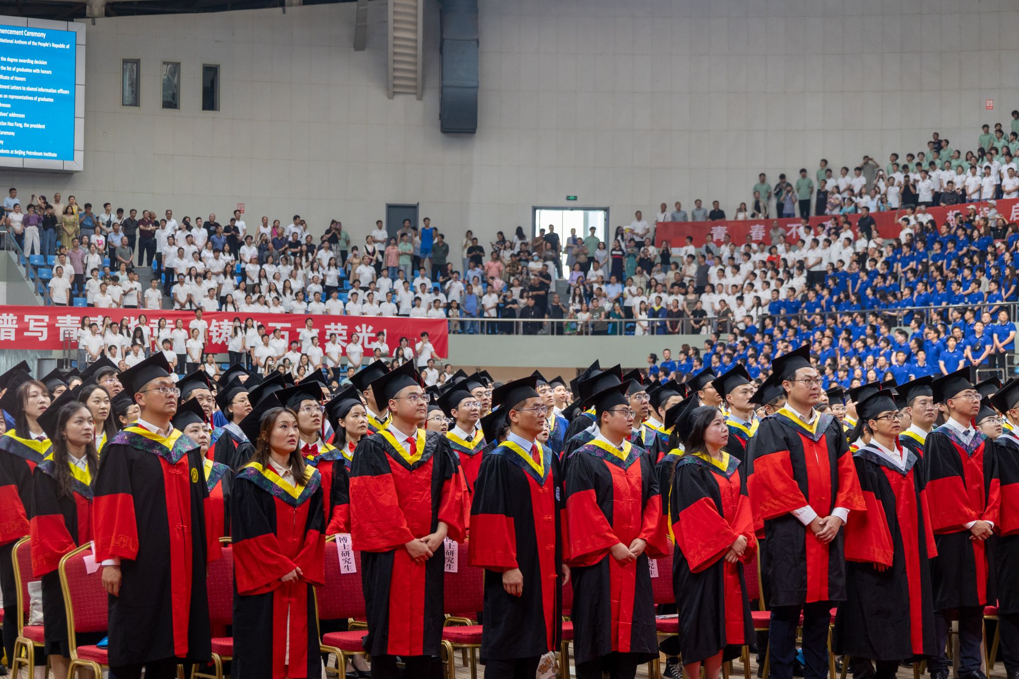 2024年毕业典礼暨学位授予仪式在现场热烈的掌声中,在师生合唱石大校歌《北京石油学院学生之歌》中落下帷幕。
