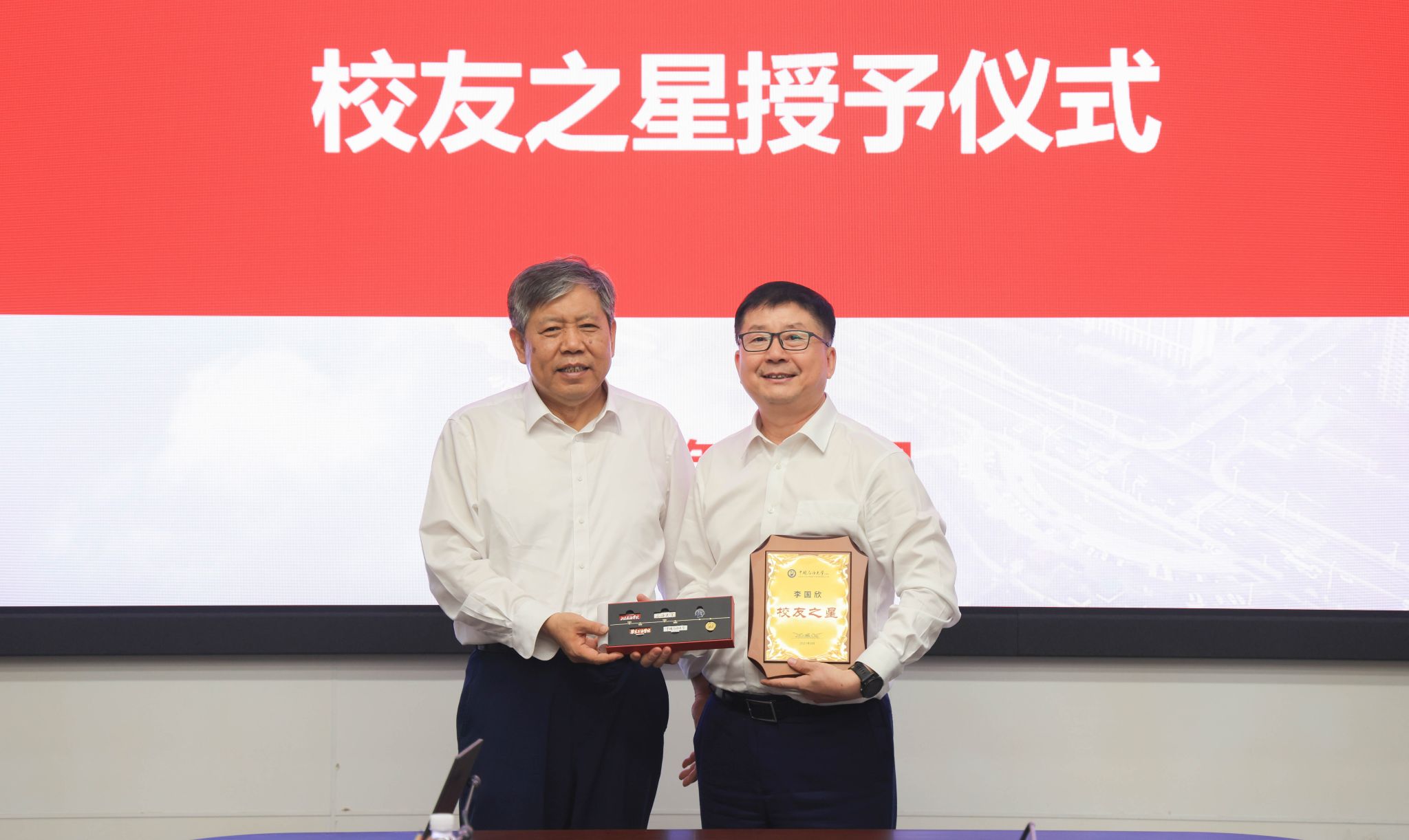 座谈中,双方相关负责人分别介绍学校和勘探院基本情况。郝芳为李国欣颁授“校友之星”奖牌。