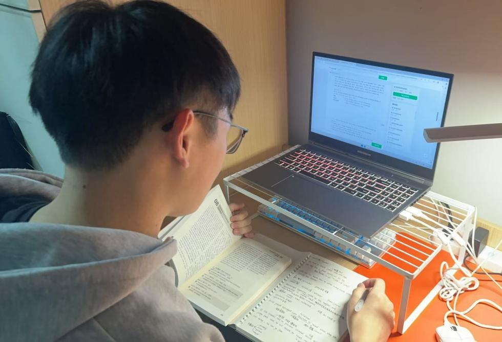 机电工程学院2023级本科生夏新健选择留校备考雅思。“为了能在考试中取得优异成绩,我决心利用寒假时间全力准备。寒假里,我系统学习了雅思考试的各项内容,不断练习听力和阅读技巧,同时加强写作和口语练习。虽然备考过程充满挑战,但也非常充实,我对即将到来的考试充满信心。”他表示,通过这段时间的集中准备,自己的英语能力有了显著提升。