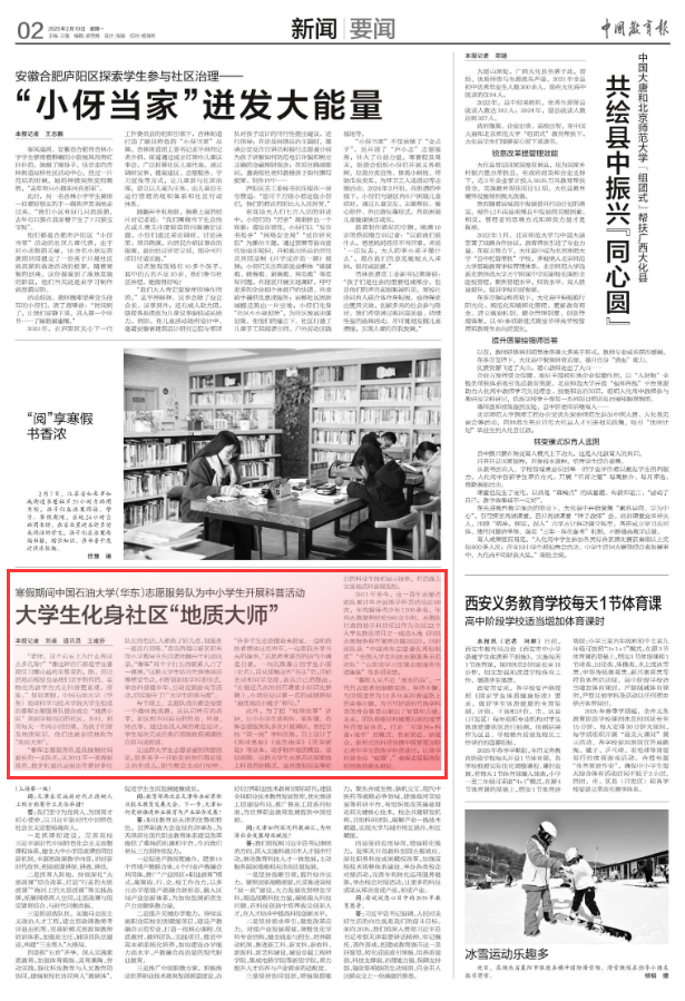 【本站讯】作为全国大学生科技志愿服务示范团队,我校春晖志愿服务队10多年来奋斗在科普道路上,为书写好新时代地学科普的青春答卷贡献出了智慧和力量。2月10日,《中国教育报》以“大学生化身社区‘地质大师’”为题对我校春晖志愿服务队寒假期间为中小学生开展科普活动的事迹进行了报道。
