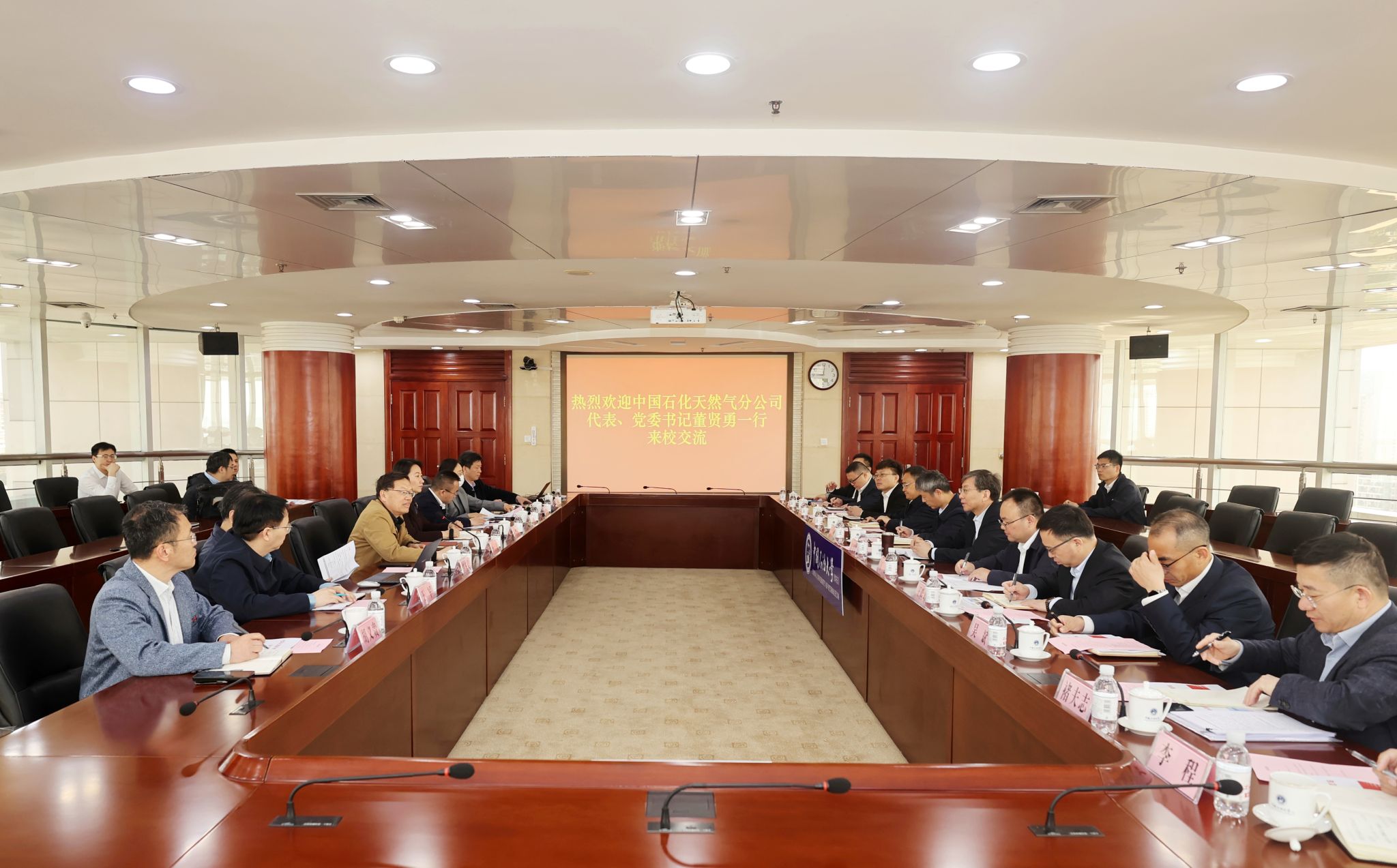 【本站讯】4月25日,中国石化天然气分公司代表、党委书记董贤勇一行来校交流,校长郝芳院士、党委副书记万云波、校长助理王效美会见来宾,双方就深化校企合作进行座谈交流。