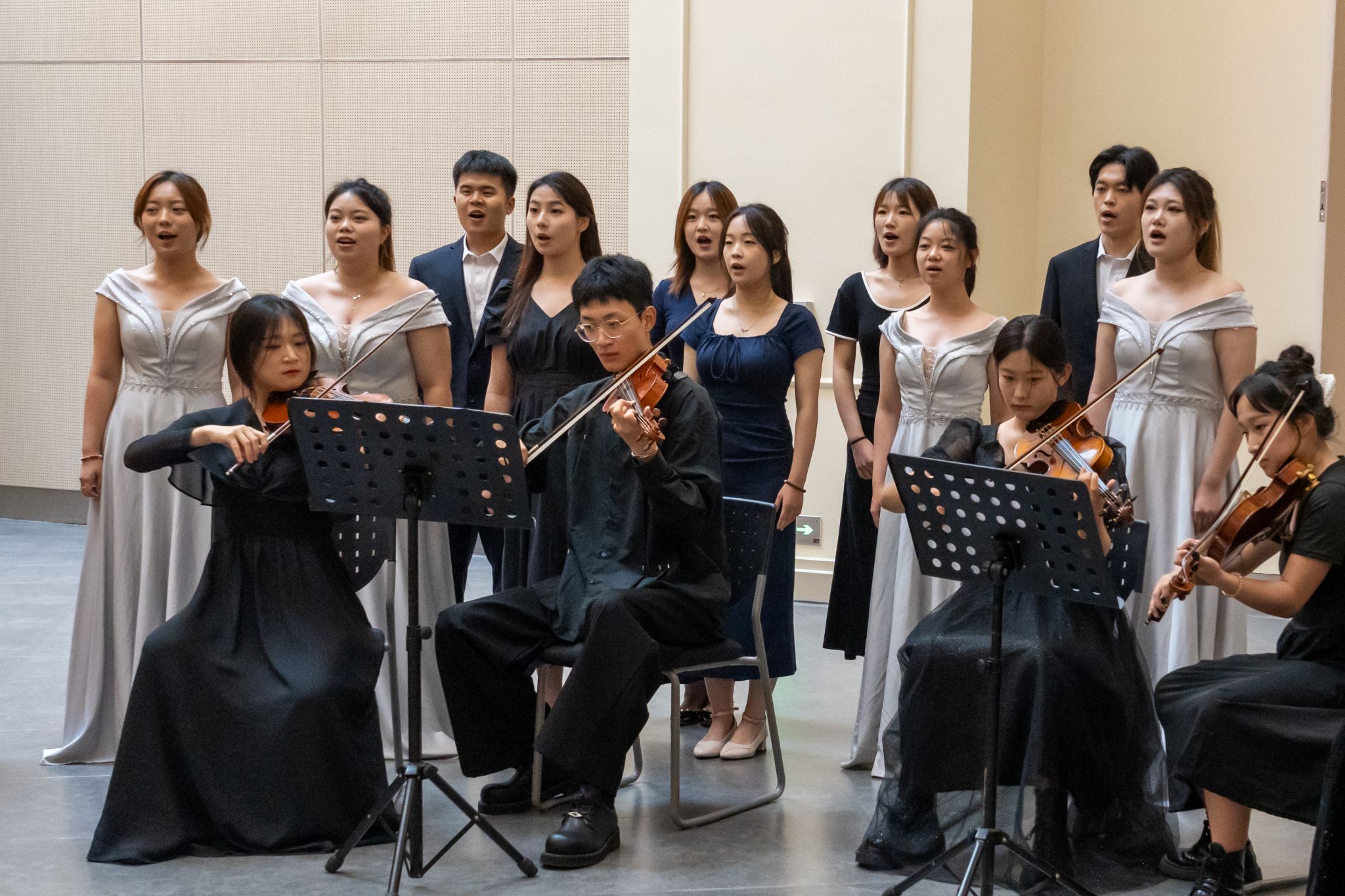 “音为有你,活力启程”迎新闪演环节,以"传统根脉·能源报国"为叙事主线,由文法学院音乐系师生倾情演绎。演出曲目涵盖了《茉莉花》《我爱你中国》《唱支山歌给党听》等广为人知的主旋律经典,每一首歌曲都饱含深情,传递着对祖国的热爱与赞美。闪演尾声,由全体演员带领新生共同唱响《开云电竞投注(华东)校歌》,激昂的旋律中一代代石大人“能源报国、为祖国献石油”的赤子情怀深深感染着每一位新生,歌声中涌动着石大人"能源报国"的精神传承。