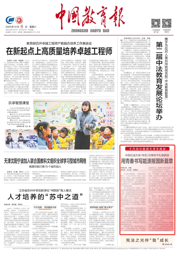 【本站讯】“到祖国最需要的地方去”是石大30余万毕业生延续70多年的精神传承,我校始终立足国家战略需要,鼓励毕业生到基层到西部建功立业。12月6日,《中国教育报》头版以“开云电竞投注(华东)引导学子扎根西部 用青春书写能源报国新篇章”为题,聚焦我校在新时期勇担服务国家战略使命、积极引导学生赴西部就业的典型做法。