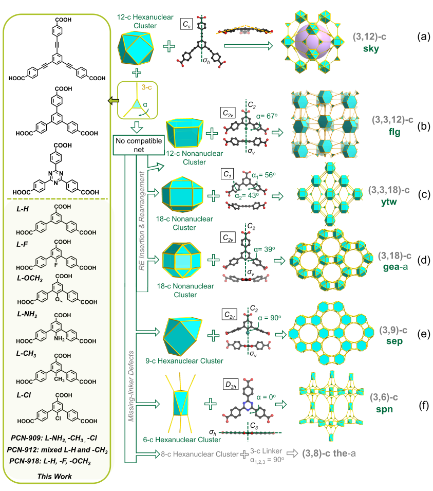 针对这一问题,孙道峰团队从多功能的稀土金属出发,利用官能团的位阻效应,从分子层面精确地设计并控制MOF结构,得到了三种新型的拓扑结构,并详细介绍了MOF材料的设计及控制策略,对多核稀土团簇的转变过程进行了解释,最后通过密度泛函理论(DFT)对提出的位阻控制策略进行了验证,从理论计算方面对观点进行佐证,并利用研究者名字简写对其进行命名(ytw),将其存于国际拓扑结构数据库中(Reticular Chemistry Structure Resource)。该项工作表明,高度复杂的网络可以通过系统和连续的空间调控来合理设计和构建,这将为功能化多孔框架材料的设计和构建提供有力的理论基础。