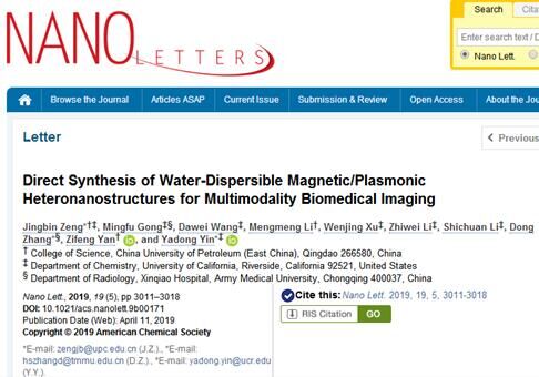 【本站讯】近日,我校理学院曾景斌副教授与陆军军医大学张冬教授、加州大学河滨分校殷亚东教授合作,在磁性/等离激元异质纳米材料研究中取得新进展,相关论文《亲水性磁性/等离激元异质纳米结构的合成及多模态生物成像应用》(Direct Synthesis of Water-Dispersible Magnetic/Plasmonic Heteronanostructures for Multimodality Biomedical Imaging)在国际材料领域权威期刊Nano Letters上发表。曾景斌为该论文第一/通讯作者,殷亚东教授、张冬教授为共同通讯作者。开云电竞投注(华东)为第一署名单位,该研究得到国家自然科学基金和中央高校基本科研业务费资助。