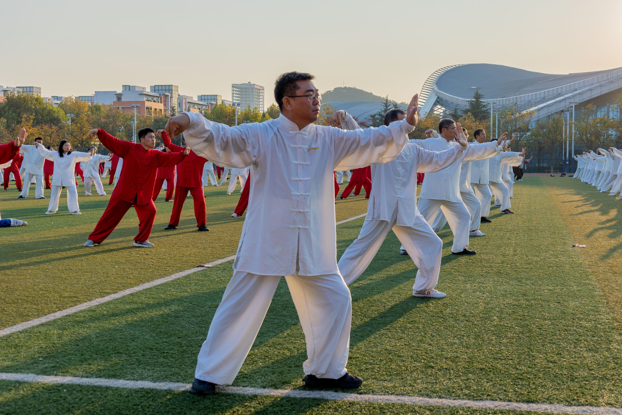 全校教职工太极拳汇演拉开了“冬季百日健身活动”的序幕,700余名教职工身穿统一的太极服,动作刚柔并济,拳法流畅自如,在缓慢而有力的招式中,充分展示了太极拳的魅力和风采。理学院、机电工程学院、马克思主义学院、石大山能新能源学院、教育发展中心、校机关、图书馆、地球科学与技术学院、石油工程学院、外国语学院10个代表队凭借出色的表现荣获优胜奖。