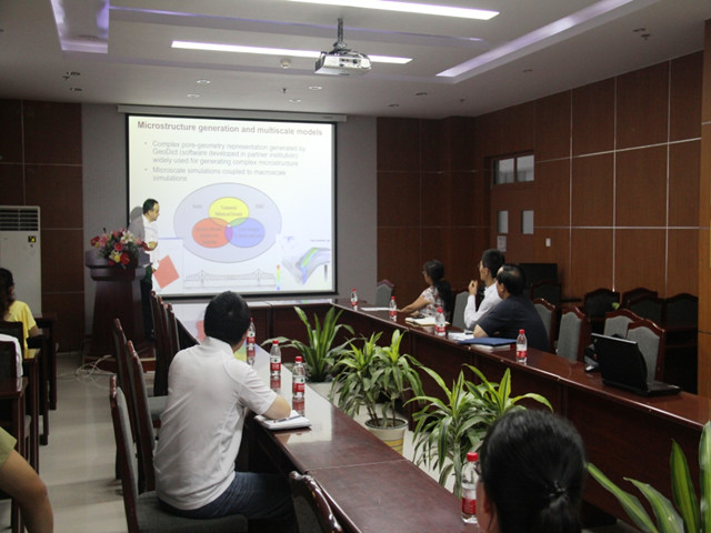 9月12日上午,姚军教授对油气渗流研究中心的学术定位和总体研究方向进行了介绍,拉开了学术交流的帷幕。油气渗流研究中心的8位师生对各自的研究进展进行了详细介绍。双方在微纳尺度渗流、多尺度数值模拟、智能油田开发、非常规油气开发等方面展开了详细的讨论。Efendiev教授对油气渗流研究中心取得的成果表示肯定。9月12日下午,Efendiev教授为师生做题为“多孔介质流动多尺度模型降阶技术及其应用”的学术报告。Efendiev教授介绍了美国德州农工大学和阿卜杜拉国王科技大学(KAUST)数值多孔介质中心的基本情况。访问期间,Efendiev教授还参观了石油工程学院油气田开发相关科研实验室。