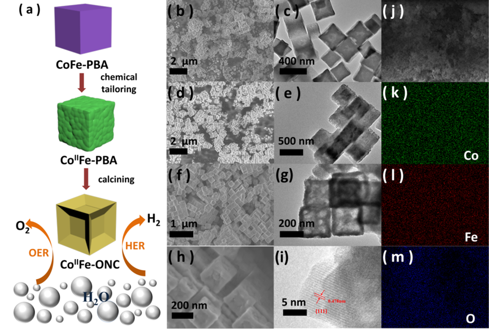 针对以上难题,鲁效庆团队利用钴铁普鲁士蓝类似物作为模板,借助溶剂热方法进行化学处理,通过改变反应体系的化学组成、处理温度等实现了钴铁氧化物纳米立方体中钴元素不同氧化态组成比例的连续调变。结果发现随着低氧化态钴(CoII)的含量增加,钴铁氧化物的OER和HER性能均不断提升。借助密度泛函理论计算发现,富含CoII的钴铁氧化物可以有效促进水的分解过程,通过优化反应路径、调节反应中间体的吸附,实现了电催化活性大幅提升。该研究为非贵金属电催化剂的电子结构调控提供了新的策略,同时也为电活性中心价态结构的进一步优化提供了实验和理论依据。