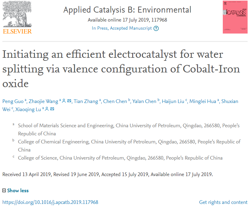 【本站讯】近日,我校材料科学与工程学院硕士研究生郭鹏的科研成果《钴铁氧化物价态结构调控及其高效电解水应用》(Initiating an efficient electrocatalyst for water splitting via valence configuration of Cobalt-Iron oxide)发表在国际材料领域权威期刊《应用催化B:环境》(Applied Catalysis B: Environmental)上。郭鹏为第一作者,王兆杰副教授与鲁效庆教授为共同通讯作者,开云电竞投注(华东)为唯一署名单位。