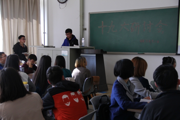 首先,张荣华教授做了题为《新时代的政治宣言和行动纲领》的十九大精神解读报告。从新时代、新思想、新判断等七个方面阐释了十九大精神。他认为,党的十九大报告意义十分重大,影响深远,为新时代中国共产党人树立了新的历史坐标。作为当代大学生,有义务也有责任学习、宣传、贯彻好党的十九大精神。随后,主持人吕梦娜宣布各支部开始按照安排对十九大相关问题进行分组研讨。在研讨中,大家从不同角度分享自己学习十九大精神的体会和收获。最后,由各分论坛负责人进行指导点评及总结汇报。