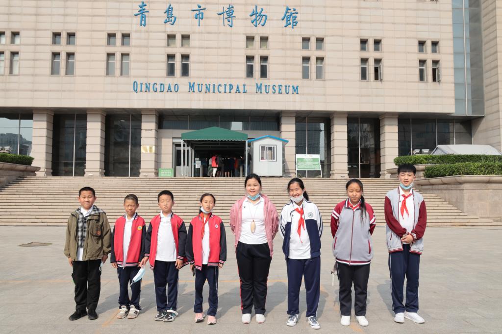 信阳县孩子们在青岛市博物馆前合照 韩月阳摄影