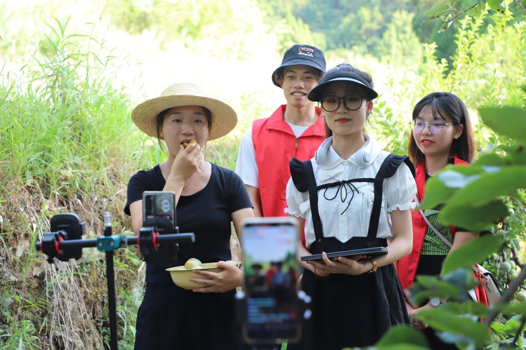 “我们的李子都是在身后这片山青水绿、阳光充足的环境中生长……”,在重庆山区的李子林里,实践队员们的红色队服十分显眼,他们正在卖力地进行线上直播带货,帮助村民销售李子。目前,直播助农在开州地区已经较为普遍,今年,当地村民种植的李子面临大量滞销的风险,在当地乡村振兴协会的帮助下,某网络直播平台认证老师周宏及团队与实践队员们帮助村民在3天时间里通过网络直播的方式出售7500斤李子,成功解决李子滞销问题。