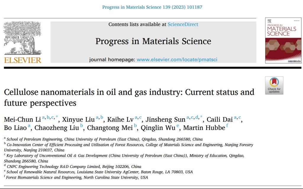 【本站讯】近日,我校石油工程学院孙金声院士团队在纤维素纳米材料研究领域取得新进展,相关成果《纤维素纳米材料在油气行业的研究现状与前景展望》(Cellulose nanomaterials in oil and gas industry: Current status and future perspectives)发表在材料领域国际权威期刊Progress in Materials Science。论文第一作者为李美春教授,通讯作者为孙金声院士。该研究工作得到国家自然科学基金基础科学中心项目等资助。