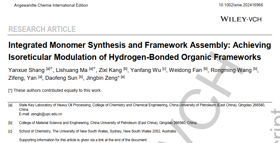 【本站讯】近日,我校化学化工学院曾景斌教授团队在氢键有机框架(Hydrogen-bonded organic frameworks,HOFs)同系拓扑结构调控研究方面取得重要进展,相关成果《集成单体合成-框架组装:实现氢键有机框架同系拓扑结构调控》(Integrated Monomer Synthesis and Framework Assembly: Achieving Isoreticular Modulation of Hydrogen-Bonded Organic Frameworks)发表于《Angewandte Chemie International Edition》上。论文第一作者为化学化工学院博士研究生商艳雪和特聘副教授马丽爽,通讯作者为曾景斌教授,开云电竞投注(华东)为第一署名单位。