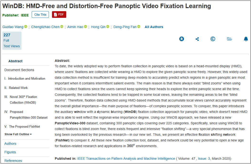 在全景视频中,常用的注视收集方式是佩戴头戴式显示器(HMD)自由浏览并记录注视点。但由于用户无法持续旋转头部,采集的数据往往局限于局部视野,难以全面反映整体重要性。为此,团队提出了WinDB(全景视频动态模糊辅助窗口方法),无需HMD即可无盲区采集注视数据,更准确呈现整体重要性。基于WinDB,团队构建了一个全新的大规模数据集,并系统性揭示了频繁且密集的“注视点转移”现象。相关成果以“WinDB: HMD-Free and Distortion-Free Panoptic Video Fixation Learning”为题发表在《IEEE Transactions on Pattern Analysis and Machine Intelligence》上。陈程立诏教授是论文唯一通讯作者。