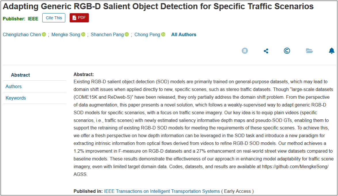 RGB-D显著性目标检测(SOD)作为计算机视觉中的重要任务,广泛应用于自动驾驶、交通监控等场景。然而,现有方法模型多基于通用数据集训练,在面对特定交通场景时存在严重的领域偏移问题,导致检测性能显著下降。针对这一挑战,研究团队提出了一种面向交通场景的RGB-D SOD领域自适应方法,通过弱监督方式自动构建高质量的可训练数据集,显著提升模型在特定场景下的检测能力,在常规数据集和实际交通数据集上均取得了优异性能。相关成果以“Adapting Generic RGB-D Salient Object Detection for Specific Traffic Scenarios”为题发表在《IEEE Transactions on Intelligent Transportation Systems》上。陈程立诏教授是论文第一作者。