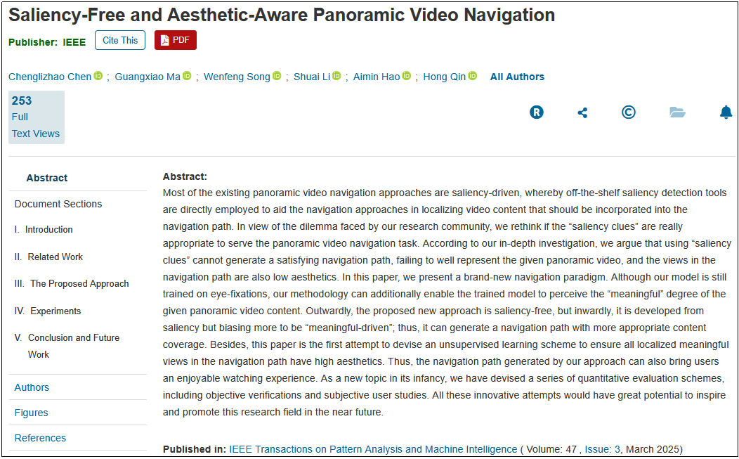 全景视频导航是类脑视觉研究中的关键应用,旨在通过模拟人类大脑的视觉处理机制,优化沉浸式视频内容的语义表达与导航效率。针对全景视频导航可用监督数据稀缺痛点,团队提出了一种全新的弱监督学习方法,通过模拟人类语义驱动的注意力分配与高阶认知表征过程,精准捕获全景视频内容的语义重要性,构建了能够精准评估和优先排序语义重要性的导航框架,为降低后继高层次虚拟现实应用的算力开销提供了创新理论支持。该研究成果以“Saliency-Free and Aesthetic-Aware Panoramic Video Navigation”为题发表在人工智能领域影响力最高的期刊《IEEE Transactions on Pattern Analysis and Machine Intelligence》。陈程立诏教授是论文第一作者。