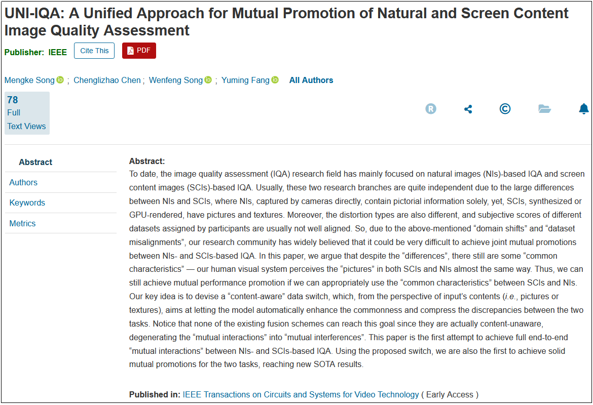 图像质量评估旨在预测图像在各种失真条件下的感知质量得分。传统研究通常将自然图像与屏幕内容图像分开处理,分别针对其独特的内容与失真特性设计独立模型。然而,由于两类图像在内容组成、失真类型及主观评分标准等方面存在显著差异,现有方法难以实现自然图像与屏幕图像质量评估任务之间的联合提升。针对这一挑战,研究团队提出了一种统一的图像质量评估框架UNI-IQA,通过引入内容感知数据切换模块,首次在自然图像与屏幕图像之间实现了基于内容区域划分的端到端相互促进学习。相关成果以“UNI-IQA: A Unified Approach for Mutual Promotion of Natural and Screen Content Image Quality Assessment”为题发表在《IEEE Transactions on Circuits and Systems for Video Technology》上。陈程立诏教授是论文唯一通讯作者。