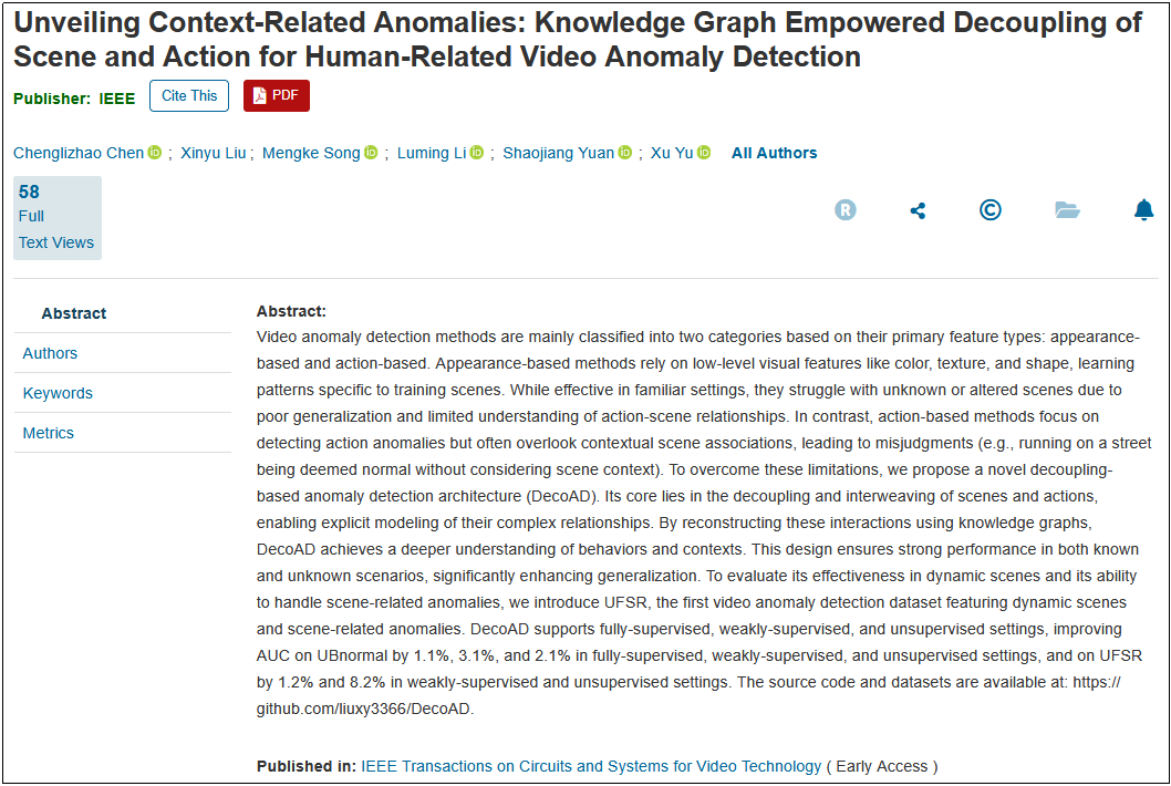 视频异常检测旨在在复杂动态环境中准确识别出异常行为。针对现有方法在处理场景相关异常时普遍存在的泛化能力弱、上下文理解不足的问题,团队提出了一种基于知识图谱的场景-动作解耦与交织模型。该模型通过引入场景与动作解耦机制,分别提取干净的背景场景与人体骨骼动作特征,并构建知识图谱对二者的复杂关系进行显式建模。随后,模型利用特征交织策略融合场景与动作信息,生成更具语义理解的异常评分,同时通过不确定性优化机制,进一步提高了边界样本的检测精度和模型泛化性能。相关成果以“Unveiling Context-Related Anomalies: Knowledge Graph Empowered Decoupling of Scene and Action for Human-Related Video Anomaly Detection”为题发表在《IEEE Transactions on Circuits and Systems for Video Technology》上。陈程立诏教授是论文第一作者。