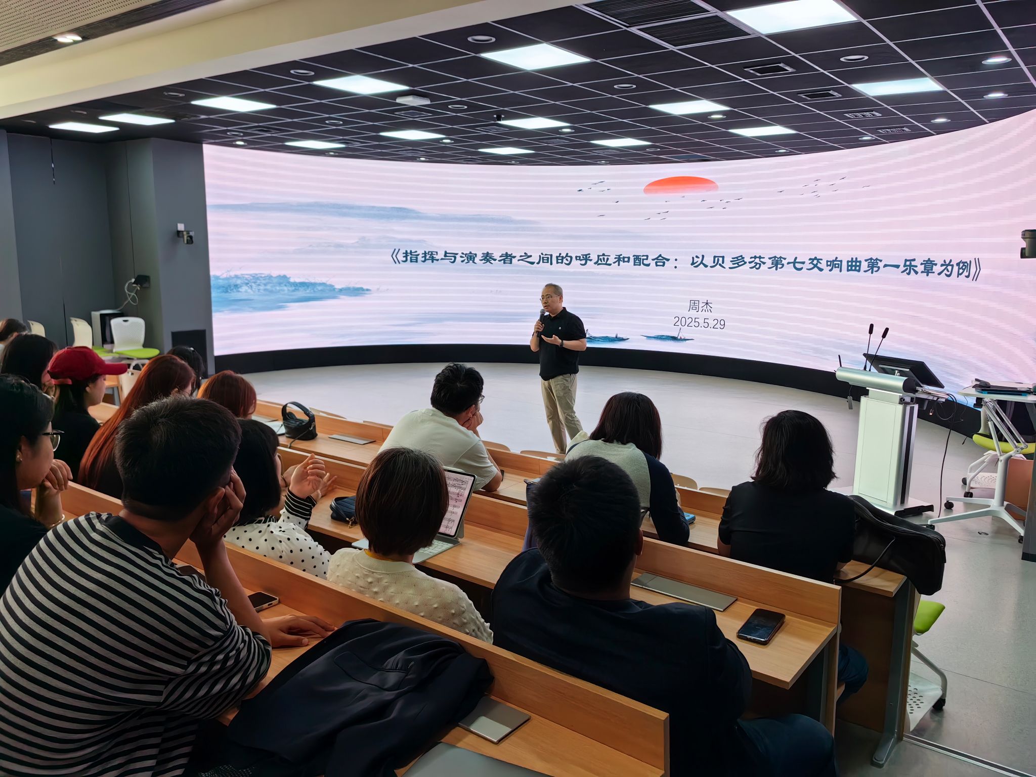 【本站讯】5月29日,浙江音乐学院副教授、硕士生导师周杰做客博雅讲堂第99讲,作题为“指挥与演奏者之间的呼应与配合”的专题讲座。讲座由荟萃学院与文法学院联合主办,文法学院副院长刘清主持,全校音乐爱好者与专业师生70余人听取讲座。